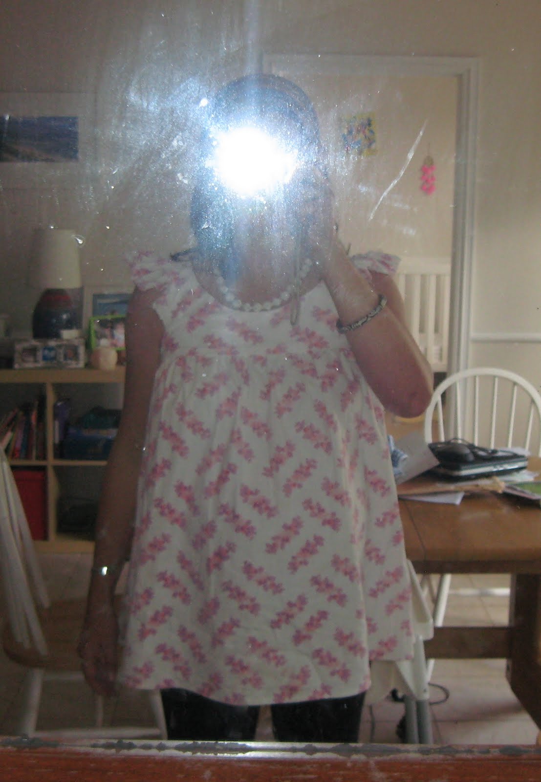 I think this is the 1st time I've done it and it was purely by accident. I dropped the little one off at daycare in pink trousers and a new flowerly tunic that I had brought for her. Then went home and finished the flowery tunic I was making for myself from an old sheet from Vinnies. Inspired of course by the lovely Bec from Naughty Shorts and her gorgeous dresses. I have 3 but despite my dress love I often find myslf in jeans and a top. So I thought I would make myself a pretty summer top (good for breastfeeding under too I hope).